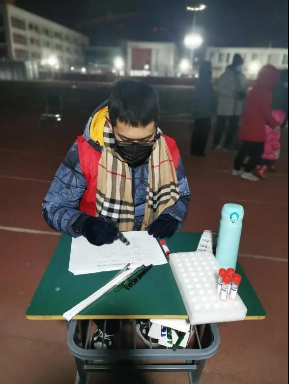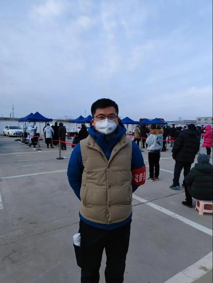 1月9日疫情发生后,常成老师主动向北辰区普东街宸宜花园社区党组织申请加入大筛查抗疫志愿者队伍。10日清晨6点30分到达指定点位后,他便开始核酸大筛查的准备工作,搬桌椅,为医疗废物垃圾桶套回收袋等。7点大筛查工作正式开始,常老师主要负责老幼病残绿色通道的秩序维持,时刻提醒前来检测的居民排队要保持一米的间隔距离,帮助不会使用智能机的老年人扫码登记等工作。下午4点多,连续工作十个小时的他终于结束志愿者工作。亲历一天的志愿服务后,常老师已经是腰腿酸痛,嗓子发哑,但是他仍表示能够顺利完成志愿者的工作,为天津抗疫尽自己的一份力量,他感到非常高兴。
