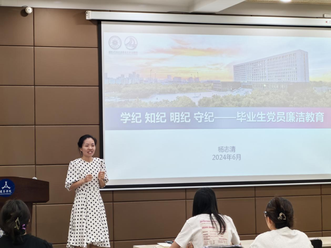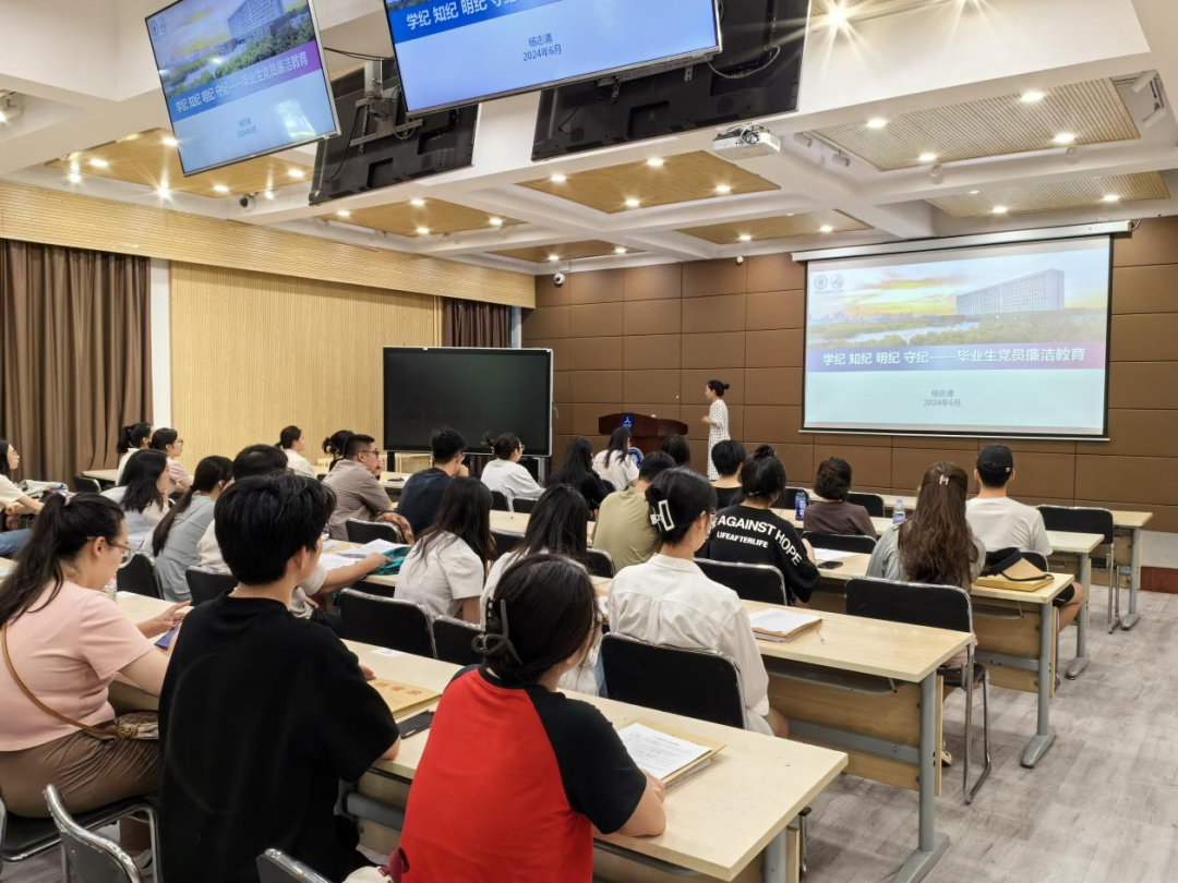杨志清以“学纪 知纪 明纪 守纪”为题开展毕业生党员廉洁专题党课,带领大家认真学习了《中国共产党纪律处分条例》的重要内容。从四个方面深入阐述了党纪的重要性,明确了作为党员应当如何在实际工作中遵守和维护党的纪律,并通过城市建设领域腐败反面案例做警示教育,引导全体毕业生党员以案为鉴,以案明纪,不断提高自身的纪律观念。她对毕业生党员殷殷嘱托,强调党纪是党的生命线,是我们党在长期革命、建设和改革实践中形成的重要法宝,更是我们党治国理政的基石。希望大家在新的学习、工作岗位上,能进一步加强党纪学习,不断提高党性修养,确保党的纪律得到严格遵守和有效执行。勉励毕业生党员要树立正确的价值观和职业观,树立良好的个人形象和党的形象,不负青春,不负韶华,用奋斗和担当服务社会、回馈母校,日后成为学校事业发展中一道最亮丽的风景线。